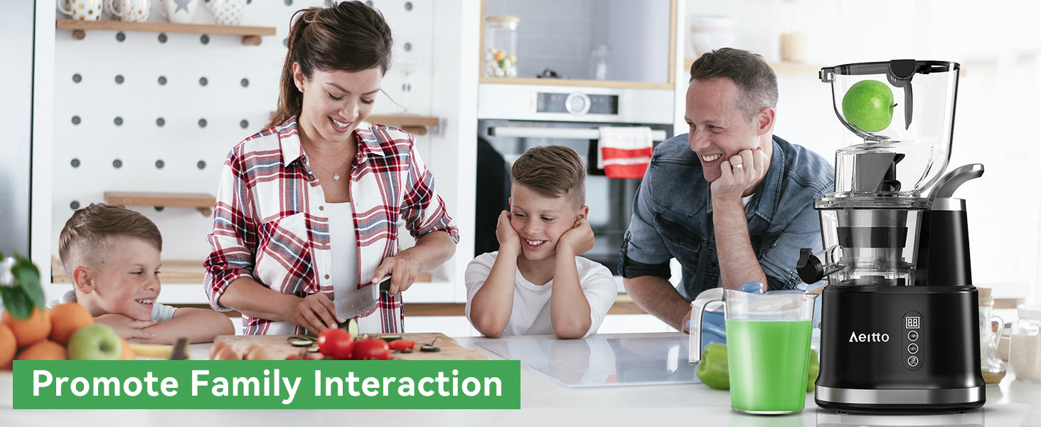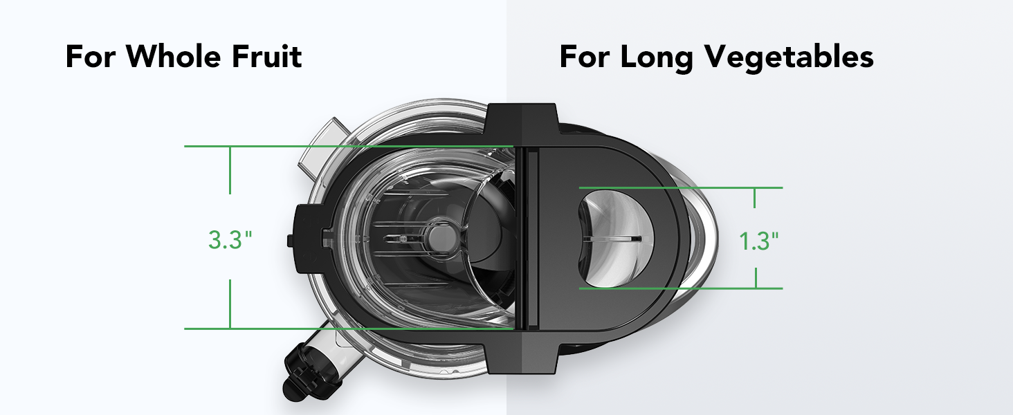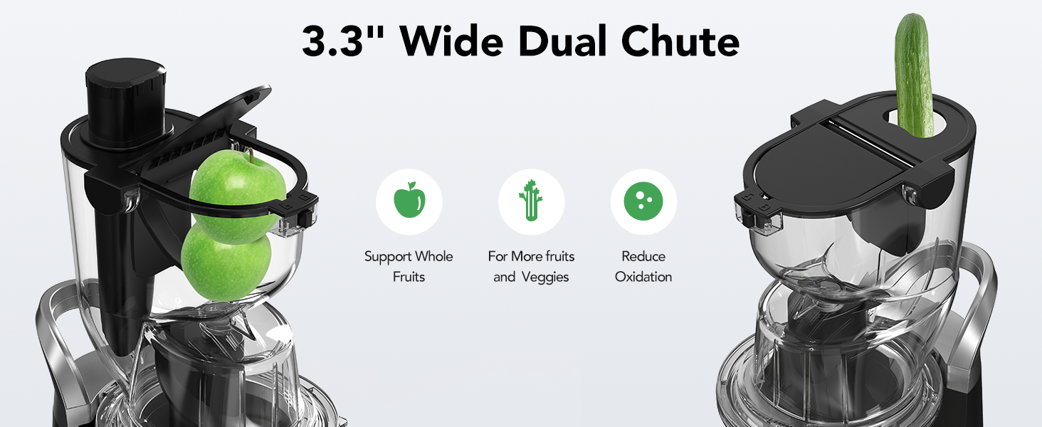 - Wide & Dual Feed Chute - Aeitto vertical Cold Press juicer with 3.3 inch large feed chute easily accepts larger pieces of fruits and vegetables and smaller feed chute for strip shape ingredients. It's perfect for the whole fruit and long vegetables. Greatly reduces preparation and cleanup time. Less chopping of the ingredients also helps to reduce oxidation.