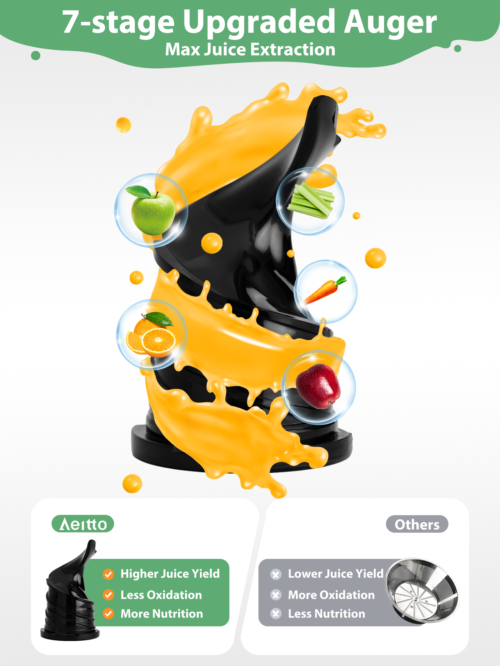 - ๐ฅฆใ๐๐ข๐ ๐ก ๐๐ข๐๐ฅ๐ & ๐๐ฎ๐ฅ๐ฉ ๐๐ฎ๐ข๐๐ ๐๐๐ฉ๐๐ซ๐๐ญ๐ข๐จ๐งใ- 7-stage upgraded cold press technology can extract a higher yield of essential nutrients and vitamins. It helps minimize oxidation and maintain the original flavor of juice. With a 250W high-power motor, the Aeitto electric juicer can efficiently separate the juice and pulp, providing purer juice, dryer pulp, and higher nutrition.