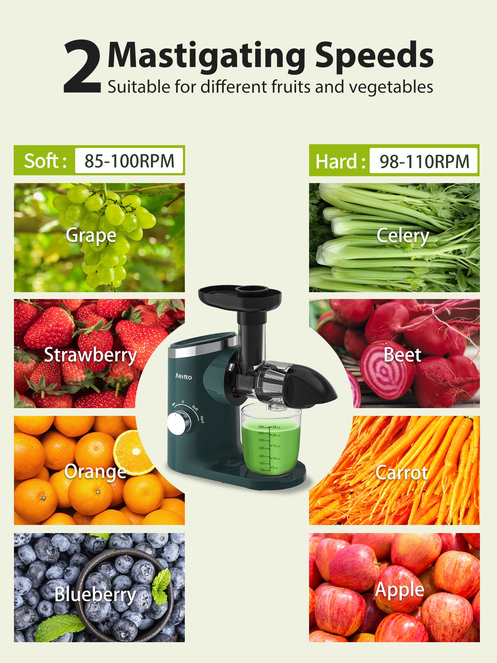 - đ„Šă2-Speed Modesă-This Aeitto slow masticating juicer with 2-speed modes can extract various vegetables and fruits.â âSOFE MODE(85-100RPM)â:orange, watermelon,grape,berryetc.â âHARD MODE(95-110RPM)â:apple, pear,carrot,beets,celery,wheat grass,ginger, kale etc.It will better extract high-purity juice and reduce the rate of oxidation.