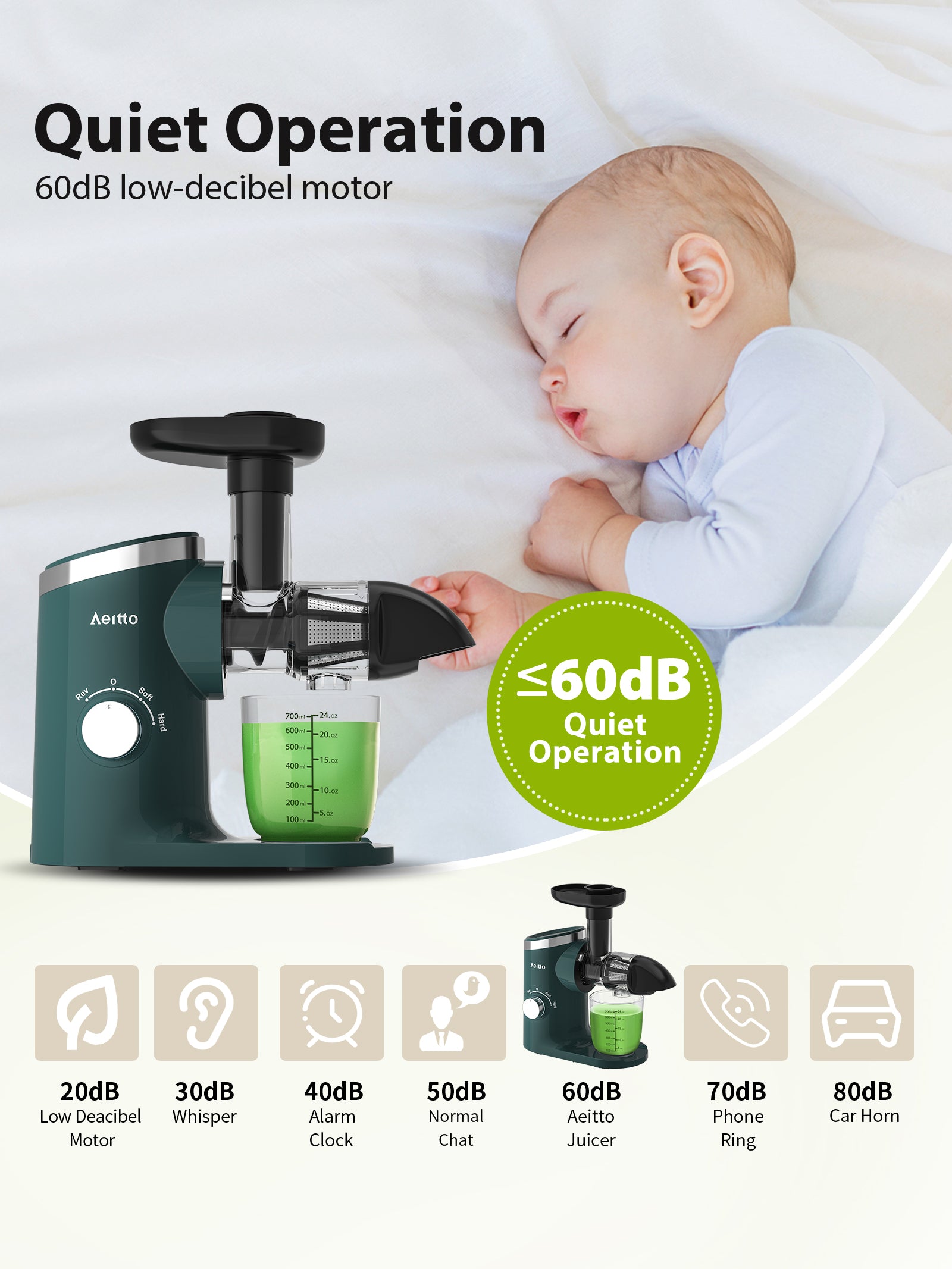 - đăUpgraded Auger & Quiet Operationă-The upgraded auger of the Aeitto Juicer Machines can better increase juicer yield, and the juice can retain more abundant nutrients and reduce oxidation.The motor operates less than 60 decibels.It stop automatically for every 20 minutes' operation.