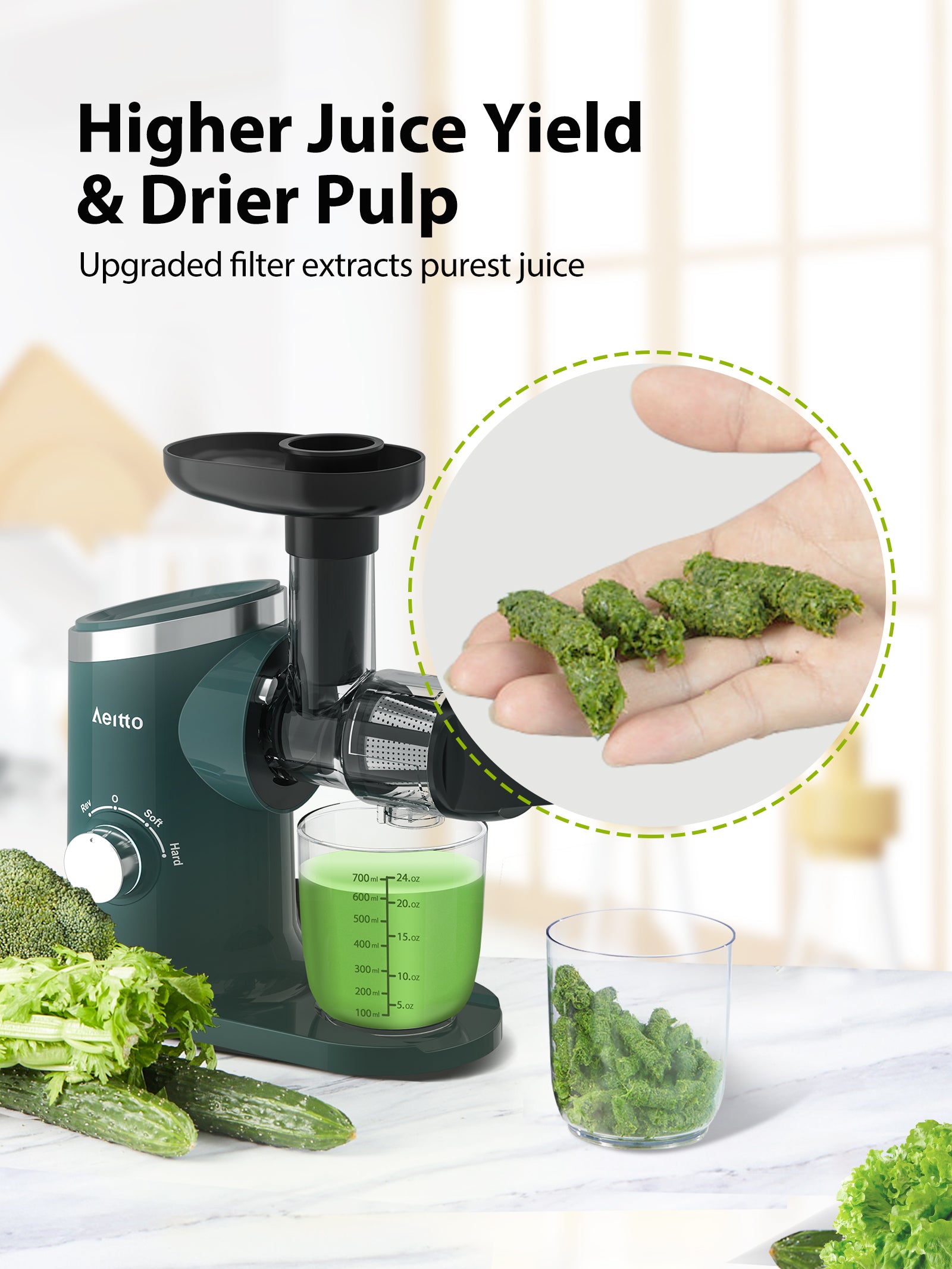 - đăJuice & Pulp Separation and Reverse Functionă-Perfectly separates the pomace from the juice,provide purest juice and vitamins for you and your family!Also,Juice Extractor Machines has reverse function to avoid stuck.You can enjoy delicious juice more easily.Aeitto Cold Press Juicer provides you with a safer and quieter juice extraction environment.