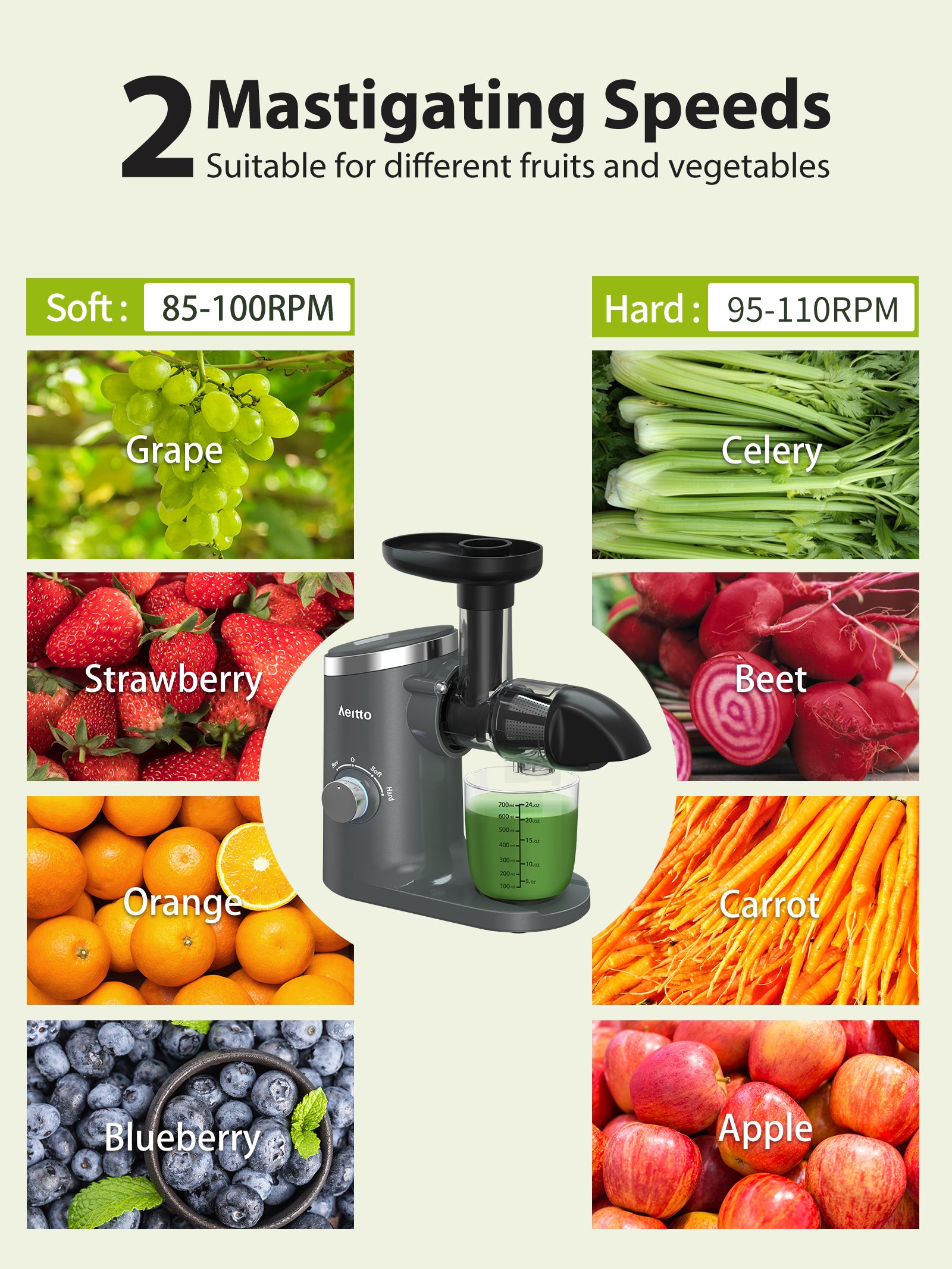 - đ„Šă2-Speed Modesă-This Aeitto slow masticating juicer with 2-speed modes can extract various vegetables and fruits.â âSOFE MODE(85-100RPM)â:orange, watermelon,grape, celery etc.â âHARD MODE(98-110RPM)â:apple, pear, carrot, beets, ginger, kale etc.It will better extract high-purity juice and reduce the rate of oxidation.