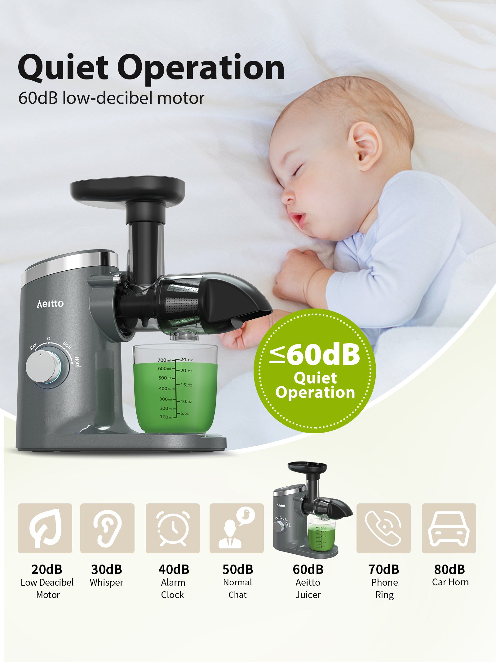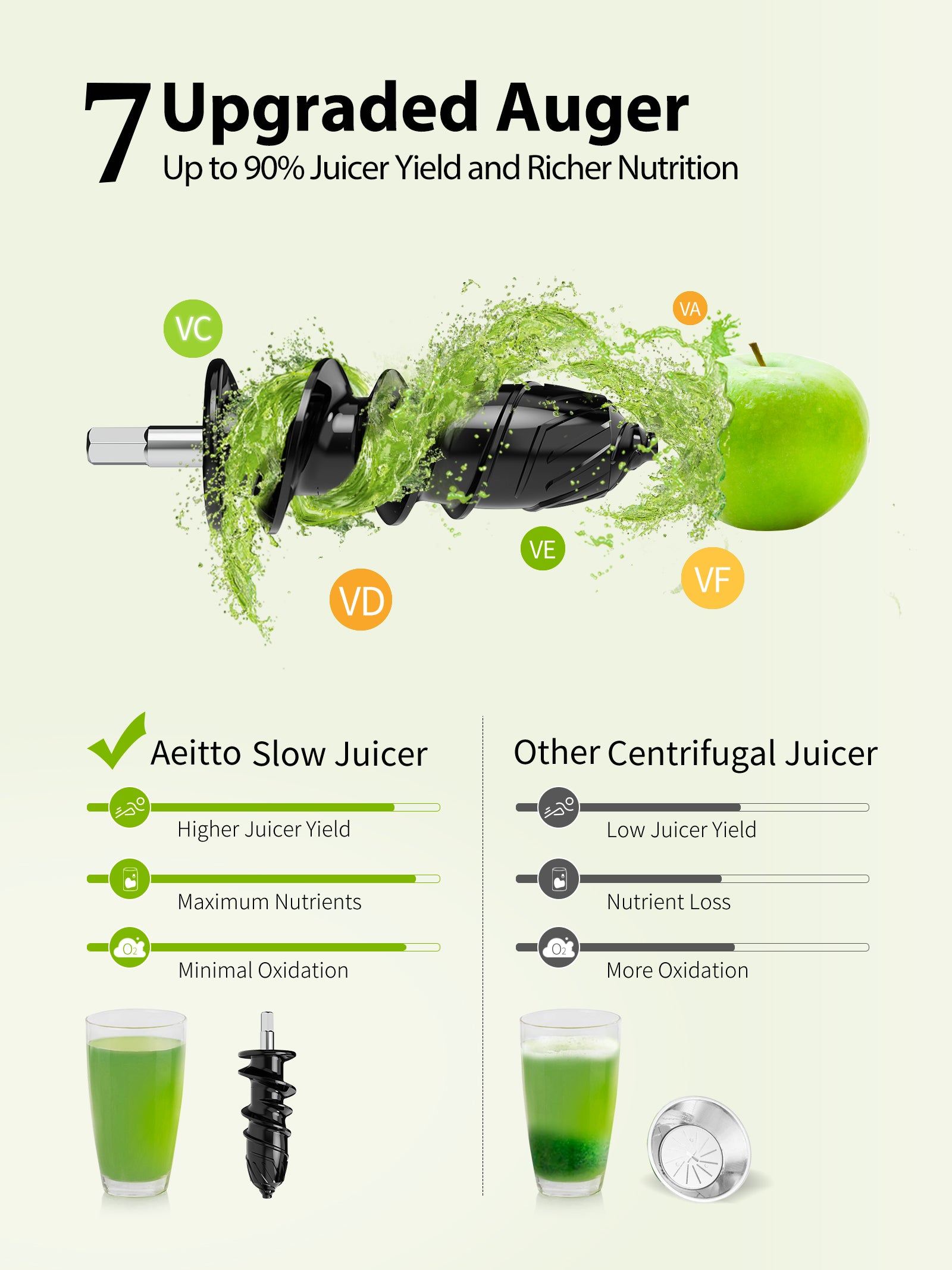 - đăUpgraded Auger & Quiet Operationă-The upgraded auger of the Aeitto Juicer Machines can better increase juicer yield, and the juice can retain more abundant nutrients and reduce oxidation.The motor operates less than 60 decibels.It stop automatically for every 20 minutes' operation.