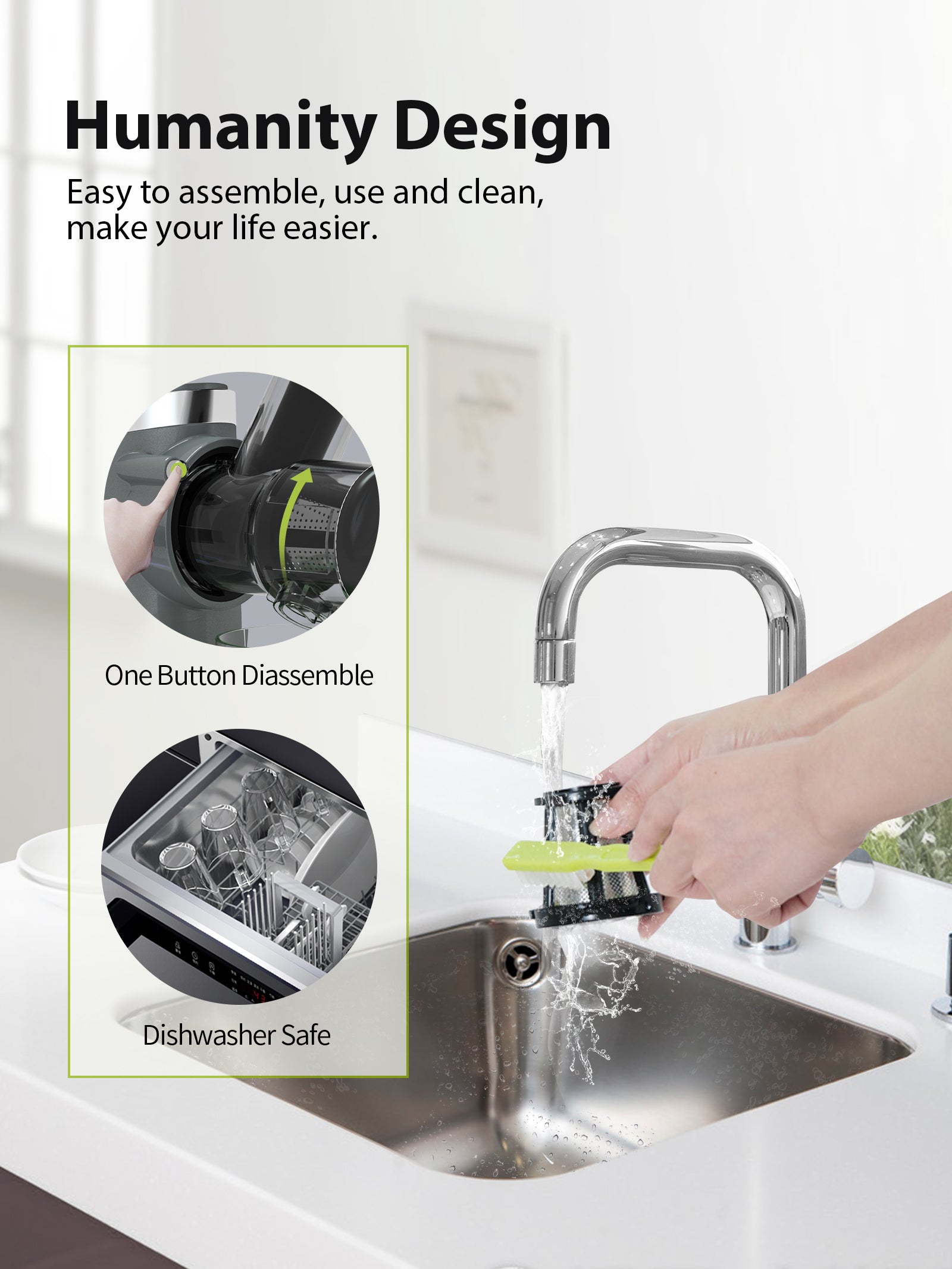 - đăEasy to Disassemble & Cleană-The one-button disassembly design eliminates the trouble of complicated disassembly.And It is equipped with a cleaning brush to make the juicers cleaner easier.The parts are dishwasher safe.