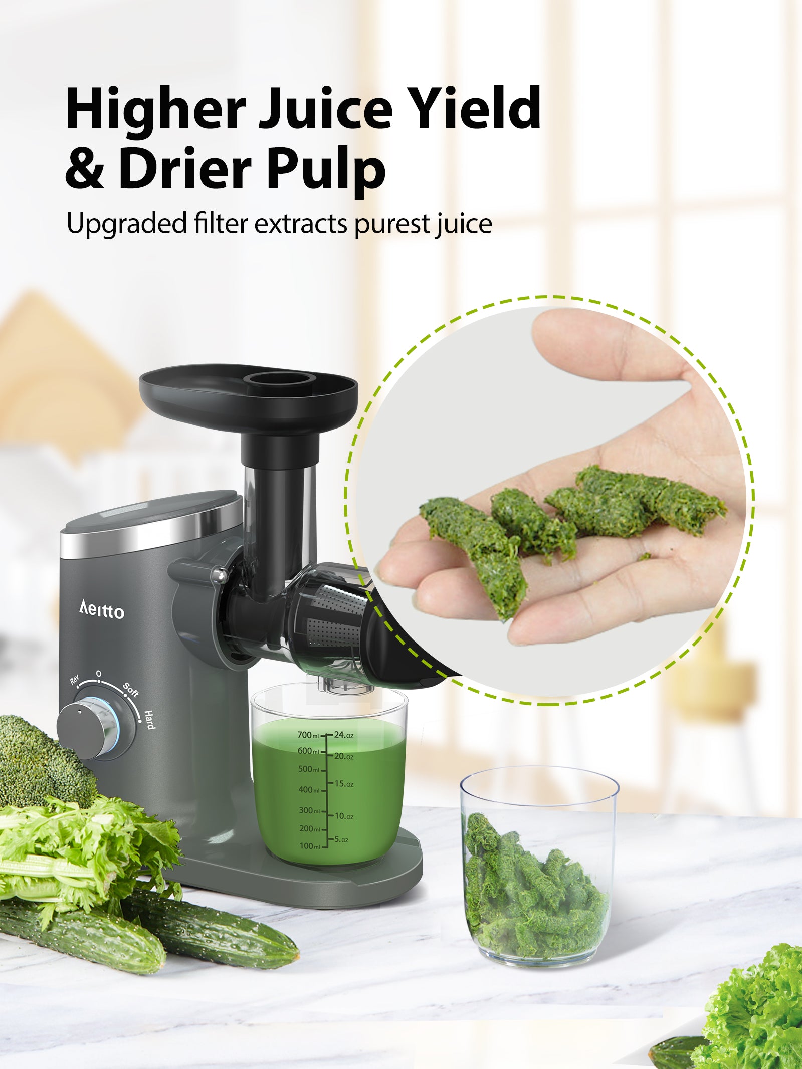 - đăJuice & Pulp Separation and Reverse Functionă-Perfectly separates the pomace from the juice,provide purest juice and vitamins for you and your family!Also,Juice Extractor Machines has reverse function to avoid stuck.You can enjoy delicious juice more easily.Aeitto Cold Press Juicer provides you with a safer and quieter juice extraction environment.