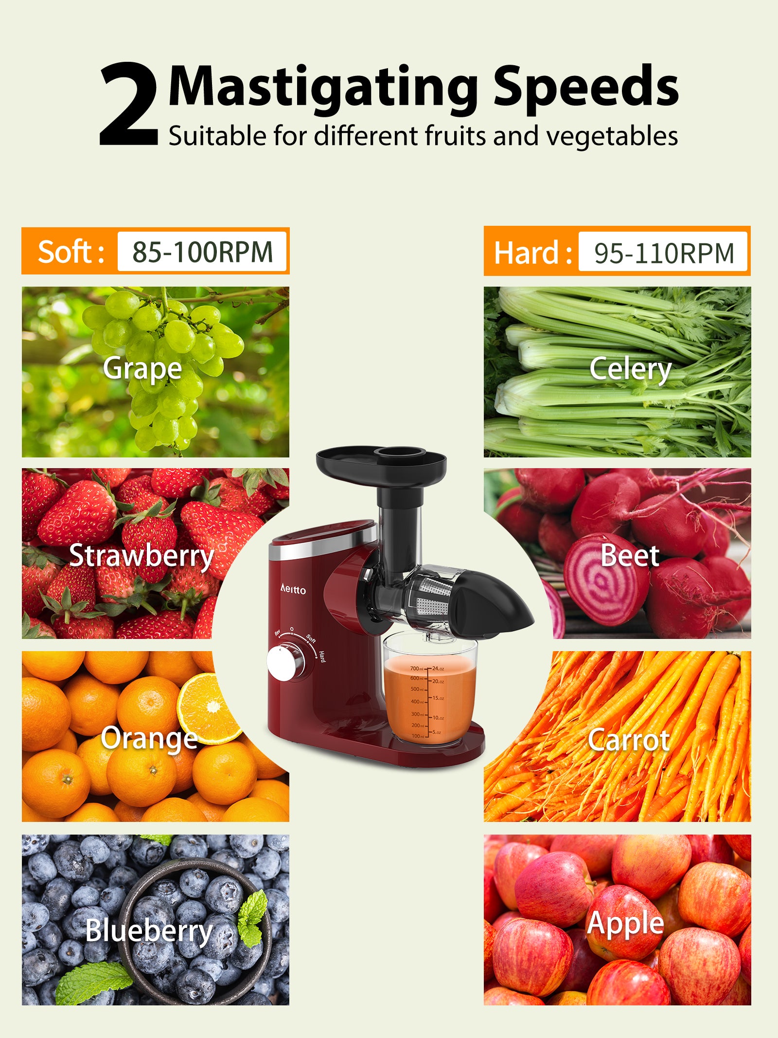 - đ„Šă2-Speed Modesă-This Aeitto slow masticating juicer with 2-speed modes can extract various vegetables and fruits.â âSOFE MODE(85-100RPM)â:orange, watermelon,grape,berryetc.â âHARD MODE(95-110RPM)â:apple, pear,carrot,beets,celery,wheat grass,ginger, kale etc.It will better extract high-purity juice and reduce the rate of oxidation.
