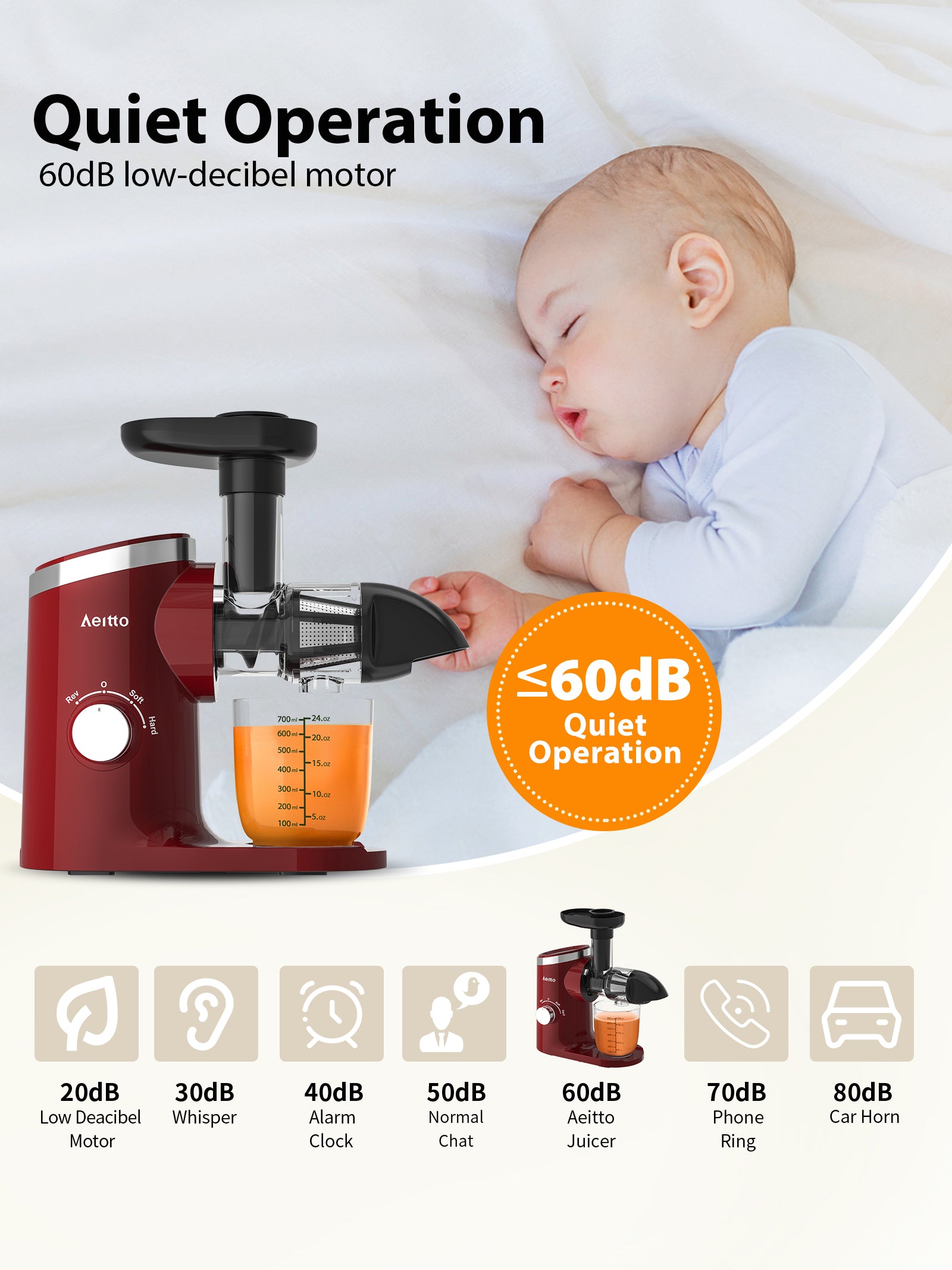 - đăUpgraded Auger & Quiet Operationă-The upgraded auger of the Aeitto Juicer Machines can better increase juicer yield, and the juice can retain more abundant nutrients and reduce oxidation.The motor operates less than 60 decibels.It stop automatically for every 20 minutes' operation.