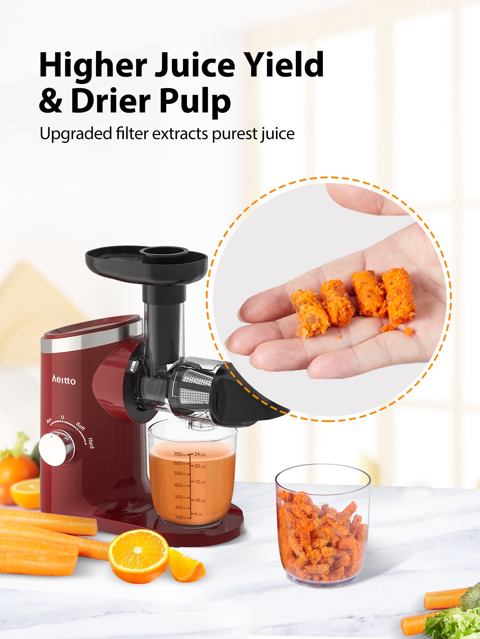 - đăJuice & Pulp Separation and Reverse Functionă-Perfectly separates the pomace from the juice,provide purest juice and vitamins for you and your family!Also,Juice Extractor Machines has reverse function to avoid stuck.You can enjoy delicious juice more easily.Aeitto Cold Press Juicer provides you with a safer and quieter juice extraction environment.