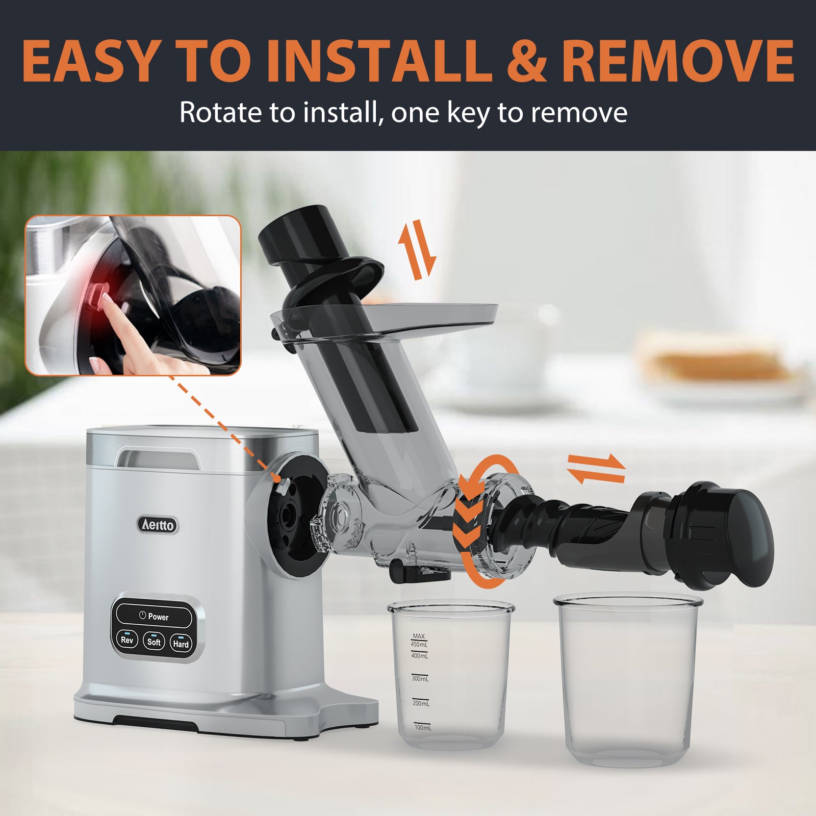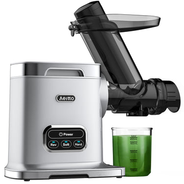 - đăSoft & Hard Modeă-Our Aeitto masticating juicer with 2-speed modes can extract various vegetables and fruits.Choose the appropriate mode according to the softness and hardness of the vegetables and fruits, so as to more fully squeeze the juice and get higher juice yield.