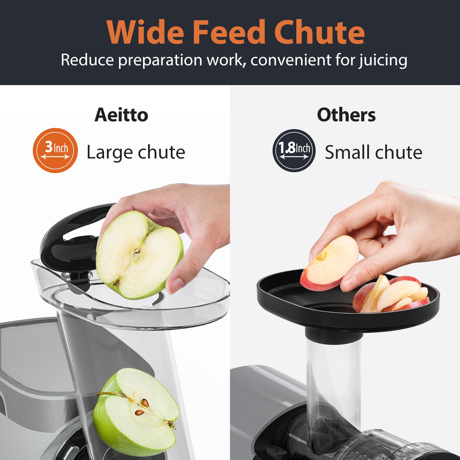 - đăWide Feedchute & Less Cutting Workă-The 3 inch big mouth Aeitto cold press juicer can squeeze more vegetables and fruits at a time. There is no need to cut fruits and vegetables into too small pieces, reducing preparation time.